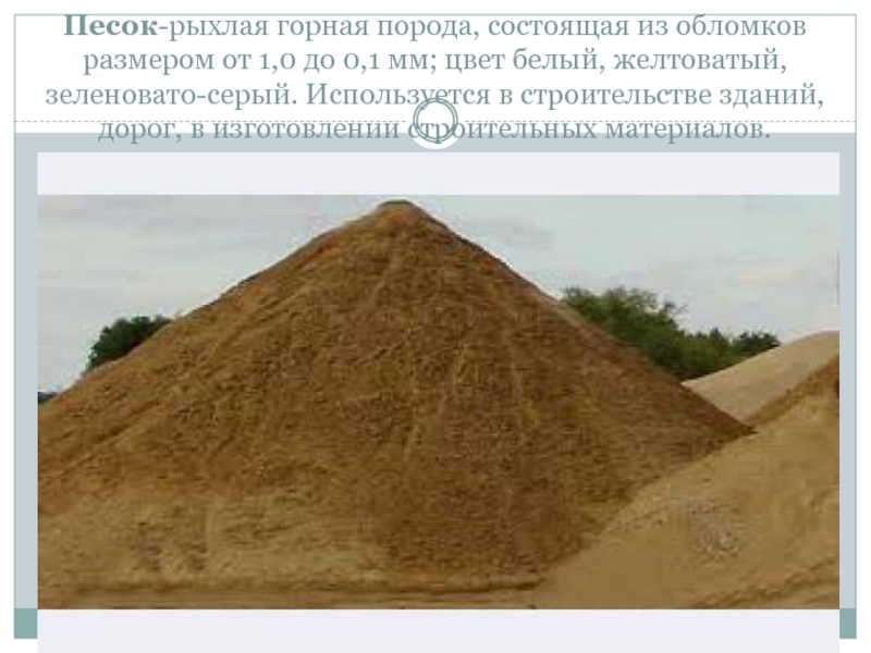 Слайд 23Песок-рыхлая горная порода, состоящая из обломков размером от 1,0 до 0,1