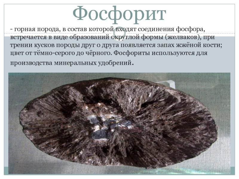 виде образований округлой формы (желваков), при трении кусков породы друг о друга появляется запах жжёной кости; цвет от тёмно-серого до чёрного. Фосфориты используются для производства минеральных удобрений.
