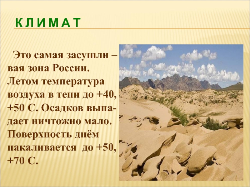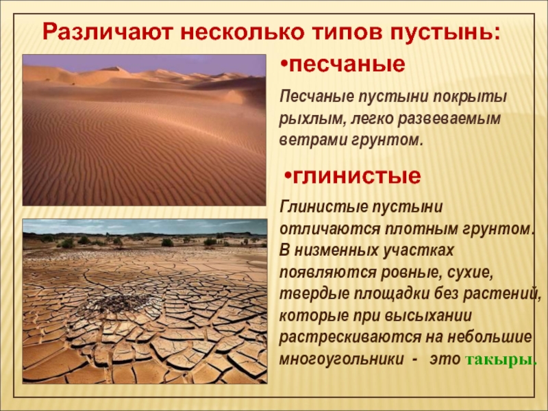 Глинистые пустыни отличаются плотным грунтом. В низменных участках появляются ровные, сухие, твердые площадки без растений, которые при высыхании растрескиваются на небольшие многоугольники - это такыры.