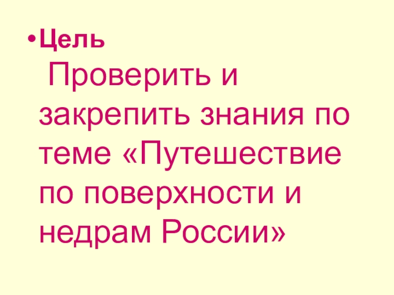 Цель  Проверить и закрепить знания по теме «Путешествие по поверхности и недрам России»