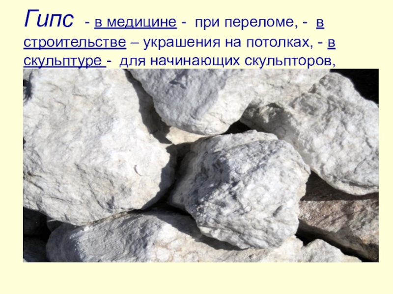 Гипс - в медицине - при переломе, - в строительстве – украшения на потолках, - в скульптуре