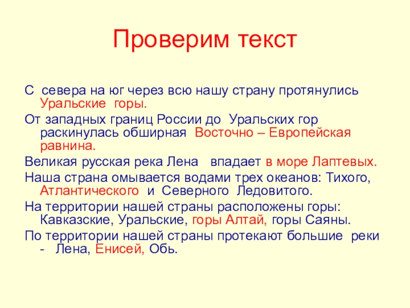 Проверим текстС севера на юг через всю нашу страну протянулись Уральские горы. От западных границ России до