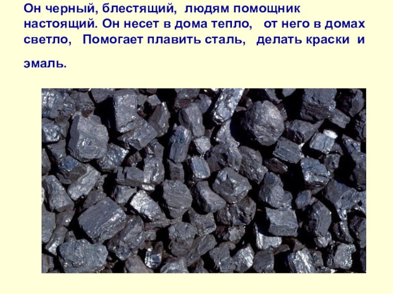 Он черный, блестящий, людям помощник настоящий. Он несет в дома тепло,  от него в домах светло,