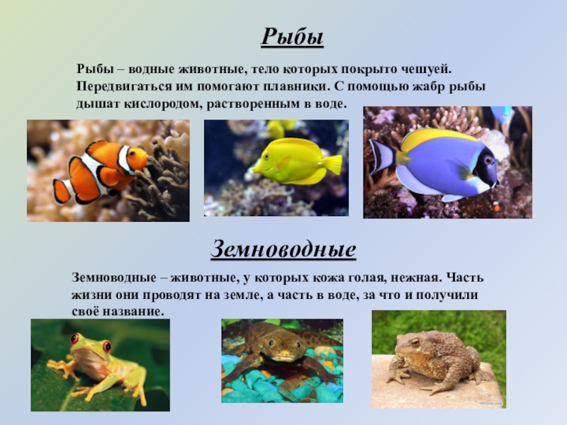 Земноводные – животные, у которых кожа голая, нежная. Часть жизни они проводят на земле, а часть в воде, за что и получили своё название.