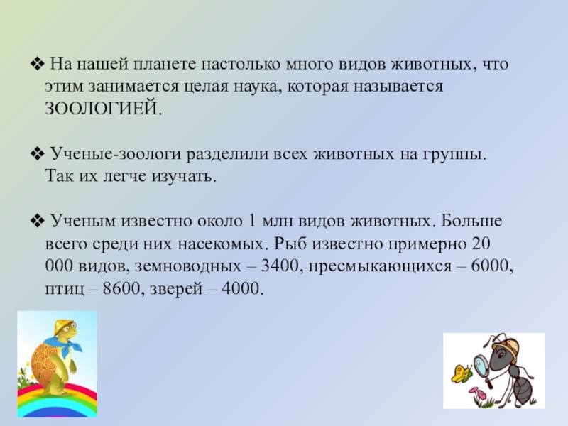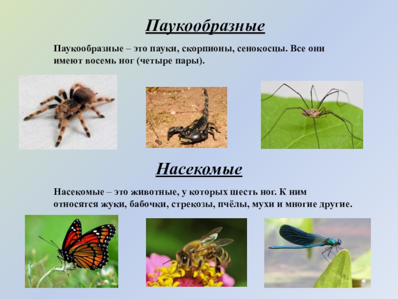 Насекомые – это животные, у которых шесть ног. К ним относятся жуки, бабочки, стрекозы, пчёлы, мухи и многие другие.