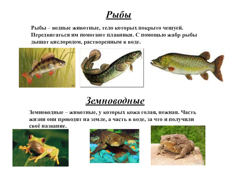 Земноводные – животные, у которых кожа голая, нежная. Часть жизни они проводят на земле, а часть в воде, за что и получили своё название.