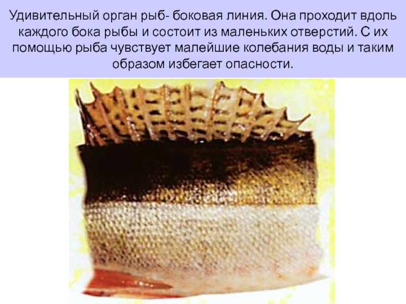 Слайд 5Удивительный орган рыб- боковая линия. Она проходит вдоль каждого бока рыбы
