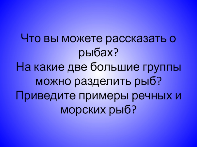 Слайд 18Что вы можете рассказать о рыбах? На какие две большие группы можно