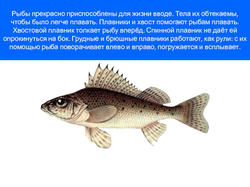 Слайд 3Рыбы прекрасно приспособлены для жизни вводе. Тела их обтекаемы, чтобы было