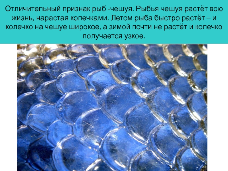 Слайд 6Отличительный признак рыб -чешуя. Рыбья чешуя растёт всю жизнь, нарастая колечками.
