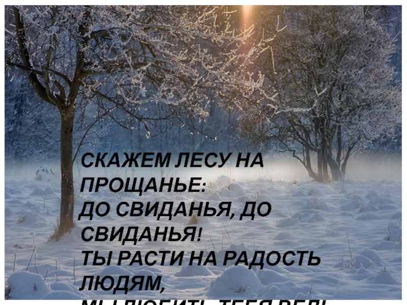 СКАЖЕМ ЛЕСУ НА ПРОЩАНЬЕ:ДО СВИДАНЬЯ, ДО СВИДАНЬЯ!ТЫ РАСТИ НА РАДОСТЬ ЛЮДЯМ,МЫ ЛЮБИТЬ ТЕБЯ ВЕДЬ БУДЕМ,ЗИМНИЙ ЛЕС, ЧУДЕСНЫЙ
