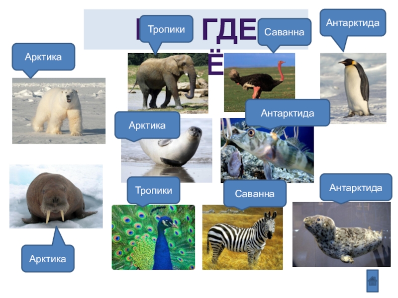 Кто где живёт?АрктикаАрктикаТропикиАрктикаСаваннаАнтарктидаТропикиСаваннаАнтарктидаАнтарктида