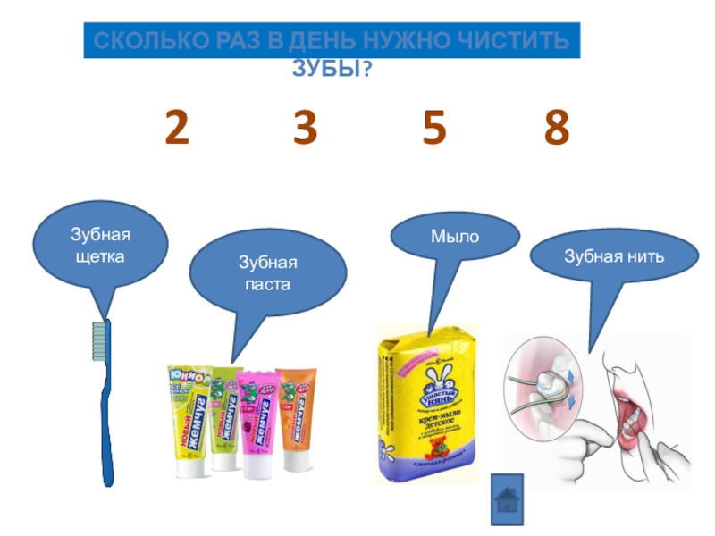 Сколько раз в день нужно чистить зубы?2358Зубная пастаЗубная щеткаМылоЗубная нить