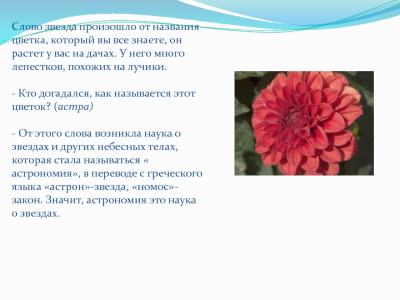 растет у вас на дачах. У него много лепестков, похожих на лучики. - Кто догадался, как называется этот цветок? (астра) - От этого слова возникла наука о звездах и других небесных телах, которая стала называться « астрономия», в переводе с греческого языка «астрон»-звезда, «номос»-закон. Значит, астрономия это наука о звездах.