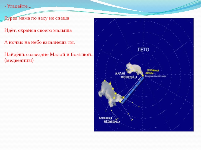 на небо взглянешь ты, Найдёшь созвездие Малой и Большой… (медведицы)