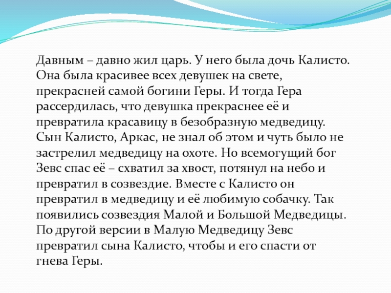 была красивее всех девушек на свете, прекрасней самой богини Геры. И тогда Гера рассердилась, что девушка прекраснее её и превратила красавицу в безобразную медведицу. Сын Калисто, Аркас, не знал об этом и чуть было не застрелил медведицу на охоте. Но всемогущий бог Зевс спас её – схватил за хвост, потянул на небо и превратил в созвездие. Вместе с Калисто он превратил в медведицу и её любимую собачку. Так появились созвездия Малой и Большой Медведицы. По другой версии в Малую Медведицу Зевс превратил сына Калисто, чтобы и его спасти от гнева Геры.