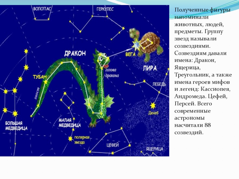 Полученные фигуры напоминали животных, людей, предметы. Группу звезд называли созвездиями. Созвездиям давали имена: Дракон, Ящерица, Треугольник, а