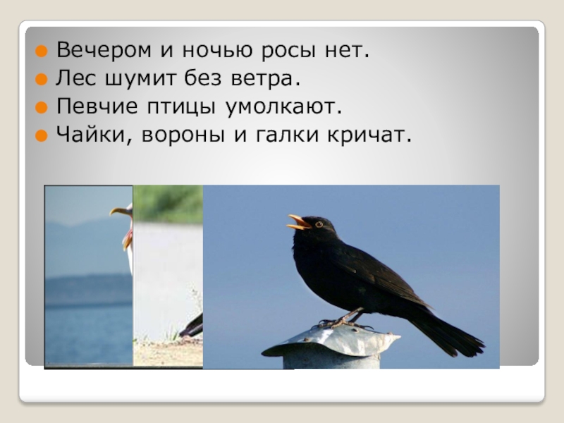 Вечером и ночью росы нет.Лес шумит без ветра.Певчие птицы умолкают.Чайки, вороны и галки кричат.