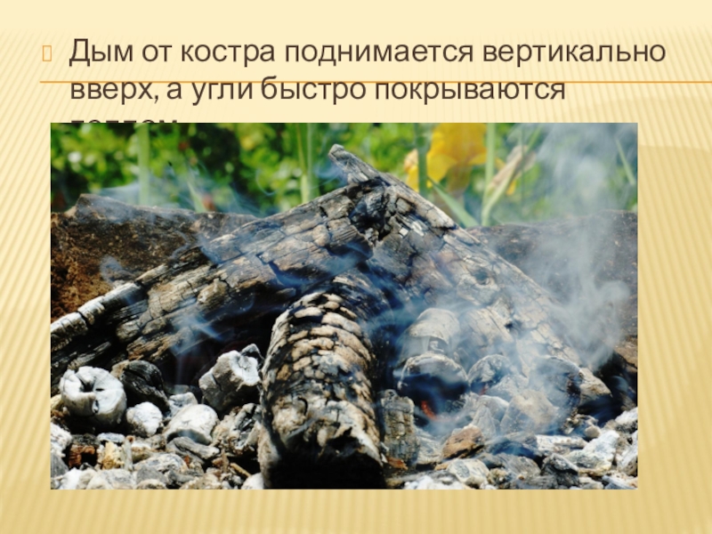 Слайд 4Дым от костра поднимается вертикально вверх, а угли быстро покрываются пеплом.