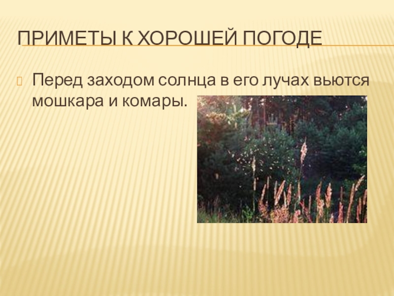Приметы к хорошей погодеПеред заходом солнца в его лучах вьются мошкара и комары.