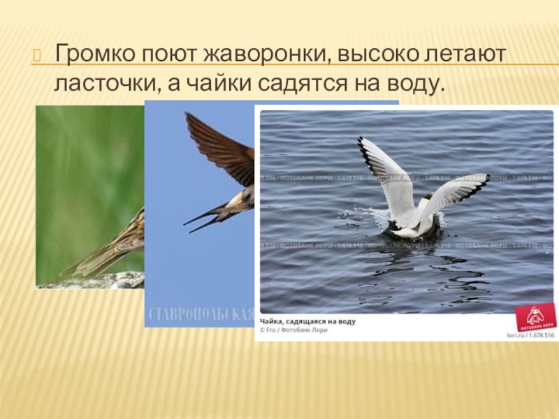 Слайд 6Громко поют жаворонки, высоко летают ласточки, а чайки садятся на воду.