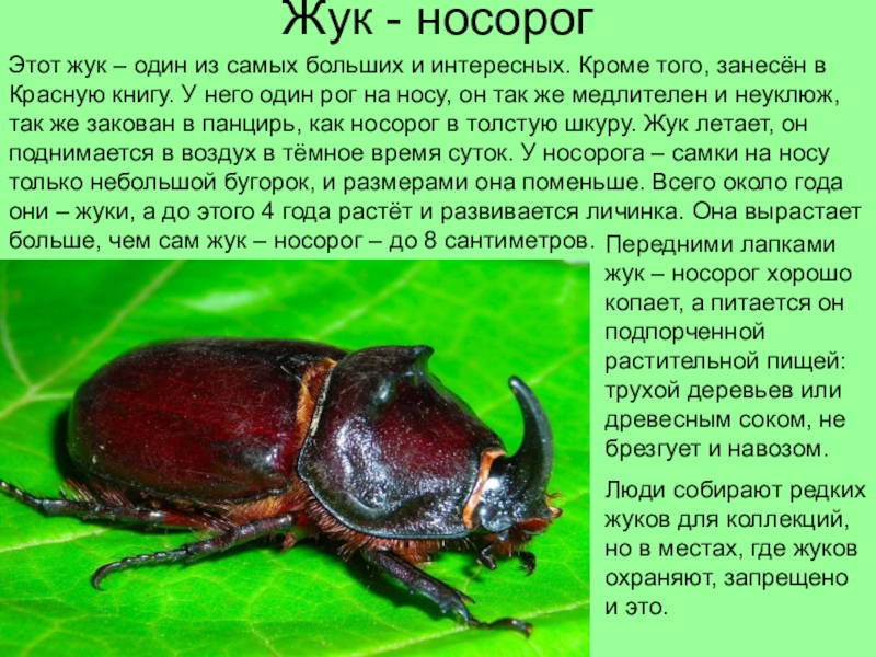 Передними лапками жук – носорог хорошо копает, а питается он подпорченной растительной пищей: трухой деревьев или древесным соком, не брезгует и навозом.