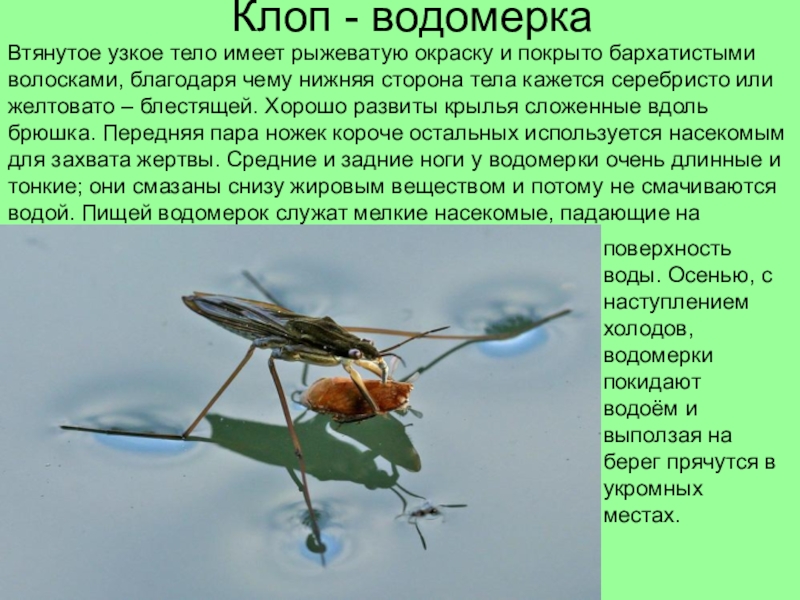 поверхность воды. Осенью, с наступлением холодов, водомерки покидают водоём и выползая на берег прячутся в укромных местах.