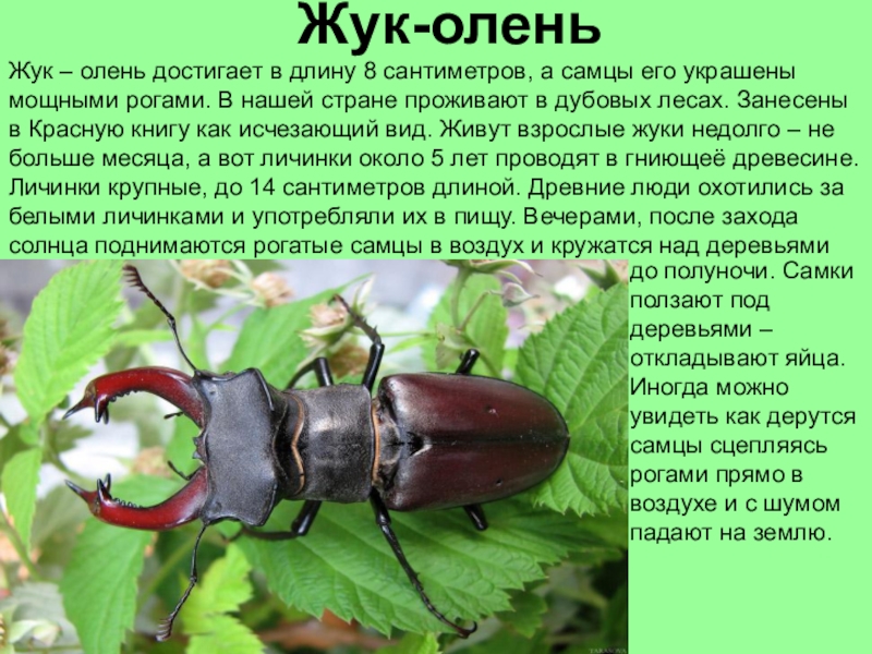 до полуночи. Самки ползают под деревьями – откладывают яйца. Иногда можно увидеть как дерутся самцы сцепляясь рогами прямо в воздухе и с шумом падают на землю.