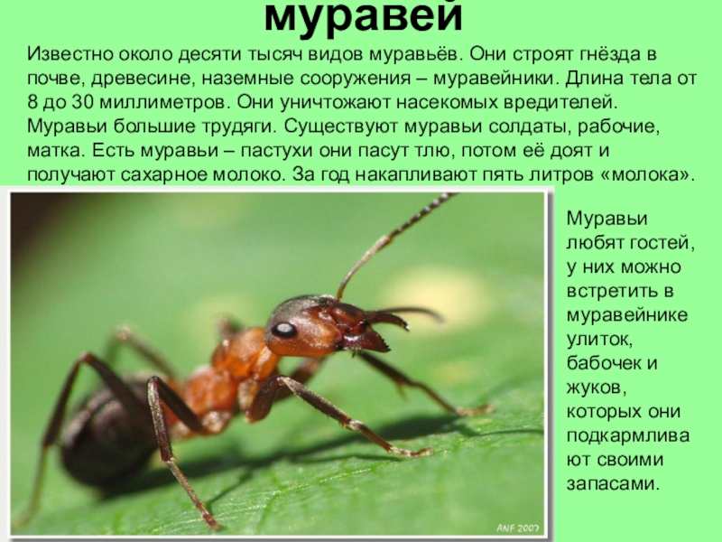Муравьи любят гостей, у них можно встретить в муравейнике улиток, бабочек и жуков, которых они подкармливают своими запасами.