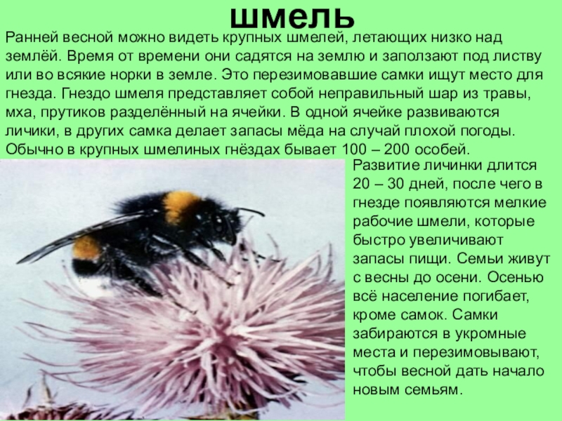 Развитие личинки длится 20 – 30 дней, после чего в гнезде появляются мелкие рабочие шмели, которые быстро увеличивают запасы пищи. Семьи живут с весны до осени. Осенью всё население погибает, кроме самок. Самки забираются в укромные места и перезимовывают, чтобы весной дать начало новым семьям.