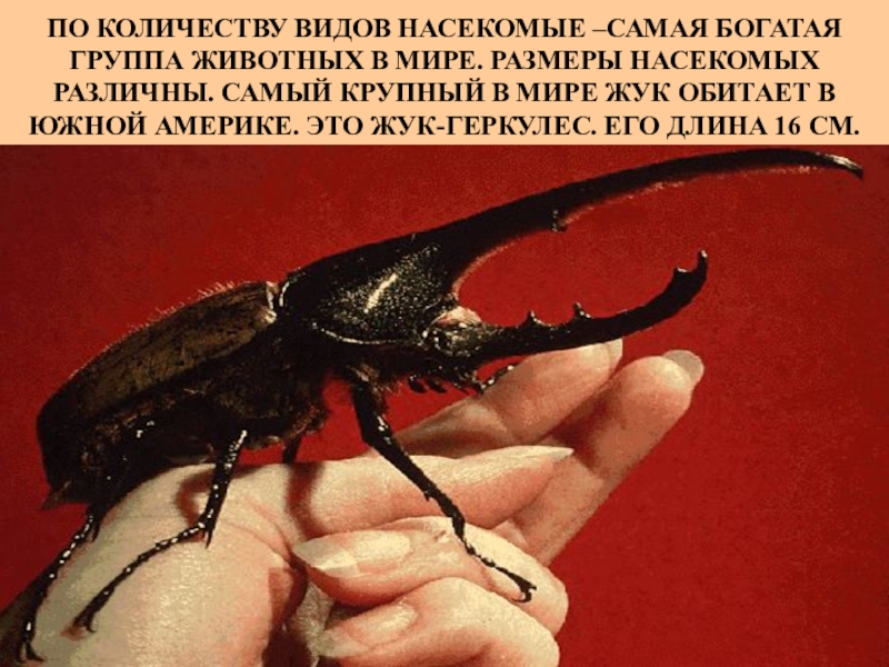 НАСЕКОМЫХ РАЗЛИЧНЫ. САМЫЙ КРУПНЫЙ В МИРЕ ЖУК ОБИТАЕТ В ЮЖНОЙ АМЕРИКЕ. ЭТО ЖУК-ГЕРКУЛЕС. ЕГО ДЛИНА 16 СМ.