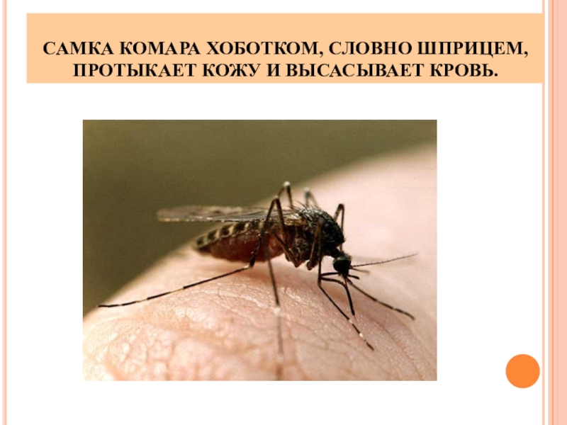 Слайд 9САМКА КОМАРА ХОБОТКОМ, СЛОВНО ШПРИЦЕМ, ПРОТЫКАЕТ КОЖУ И ВЫСАСЫВАЕТ КРОВЬ.
