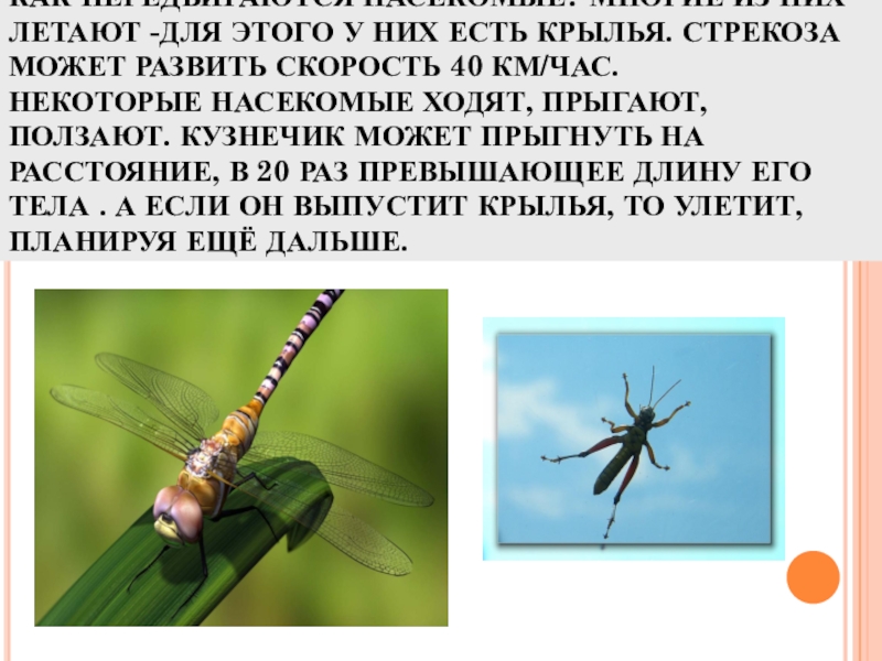 ЕСТЬ КРЫЛЬЯ. СТРЕКОЗА МОЖЕТ РАЗВИТЬ СКОРОСТЬ 40 КМ/ЧАС. НЕКОТОРЫЕ НАСЕКОМЫЕ ХОДЯТ, ПРЫГАЮТ, ПОЛЗАЮТ. КУЗНЕЧИК МОЖЕТ ПРЫГНУТЬ НА РАССТОЯНИЕ, В 20 РАЗ ПРЕВЫШАЮЩЕЕ ДЛИНУ ЕГО ТЕЛА . А ЕСЛИ ОН ВЫПУСТИТ КРЫЛЬЯ, ТО УЛЕТИТ, ПЛАНИРУЯ ЕЩЁ ДАЛЬШЕ.