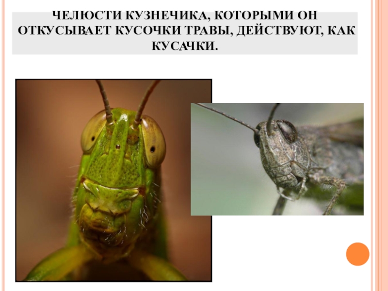 Слайд 8ЧЕЛЮСТИ КУЗНЕЧИКА, КОТОРЫМИ ОН ОТКУСЫВАЕТ КУСОЧКИ ТРАВЫ, ДЕЙСТВУЮТ, КАК КУСАЧКИ.