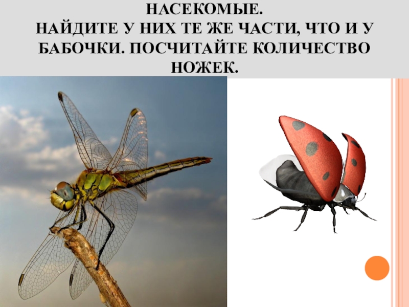 СТРЕКОЗА И БОЖЬЯ КОРОВКА-ЭТО ТОЖЕ НАСЕКОМЫЕ. НАЙДИТЕ У НИХ ТЕ ЖЕ ЧАСТИ, ЧТО И У БАБОЧКИ. ПОСЧИТАЙТЕ
