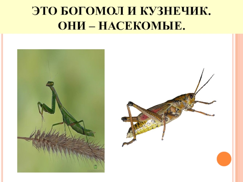 Слайд 5ЭТО БОГОМОЛ И КУЗНЕЧИК. ОНИ – НАСЕКОМЫЕ.