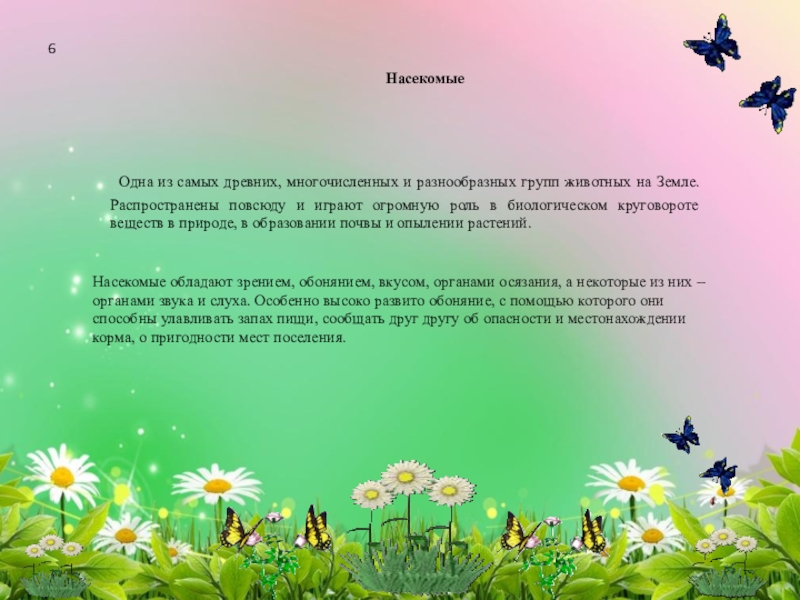 Насекомые обладают зрением, обонянием, вкусом, органами осязания, а некоторые из них -- органами звука и слуха. Особенно высоко развито обоняние, с помощью которого они способны улавливать запах пищи, сообщать друг другу об опасности и местонахождении корма, о пригодности мест поселения.