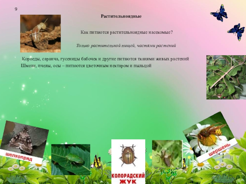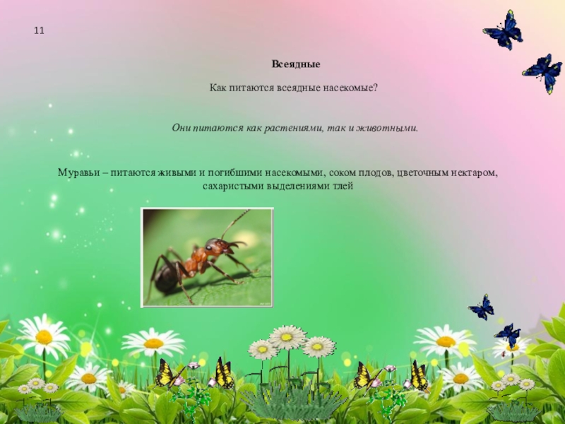 Муравьи – питаются живыми и погибшими насекомыми, соком плодов, цветочным нектаром, сахаристыми выделениями тлей