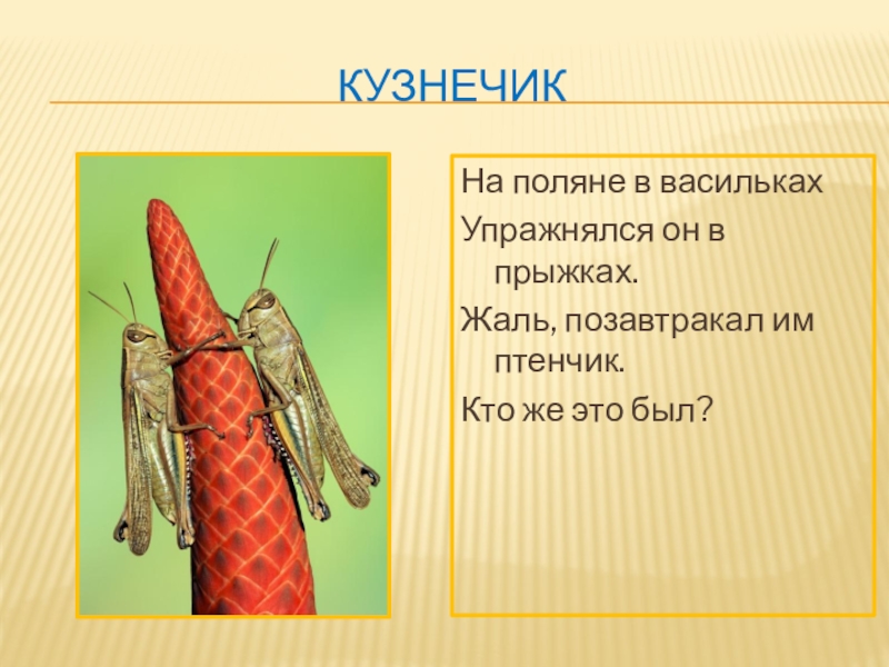 кузнечикНа поляне в василькахУпражнялся он в прыжках.Жаль, позавтракал им птенчик.Кто же это был?