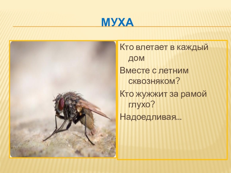 мухаКто влетает в каждый домВместе с летним сквозняком?Кто жужжит за рамой глухо?Надоедливая...