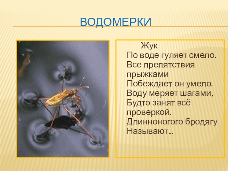 Водомерки      Жук  По воде гуляет смело. Все препятствия прыжками Побеждает он