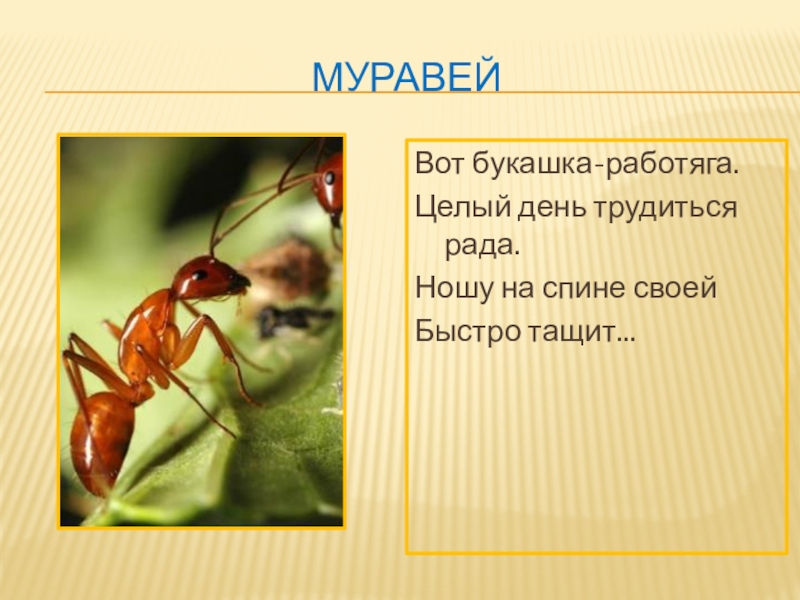 муравейВот букашка-работяга.Целый день трудиться рада.Ношу на спине своейБыстро тащит...