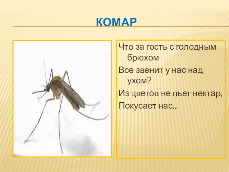 комарЧто за гость с голодным брюхомВсе звенит у нас над ухом?Из цветов не пьет нектар,Покусает нас...