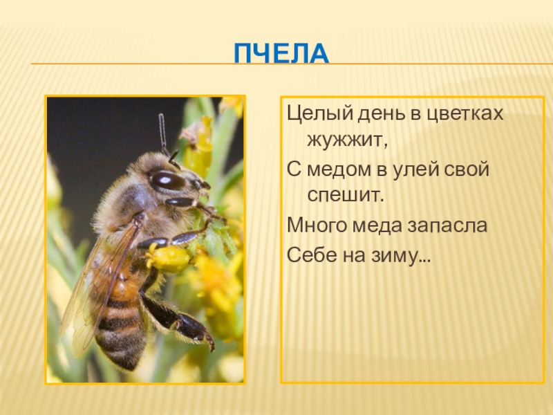 пчелаЦелый день в цветках жужжит,С медом в улей свой спешит.Много меда запаслаСебе на зиму...