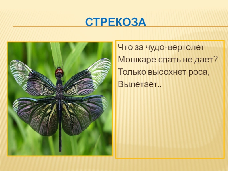 стрекозаЧто за чудо-вертолетМошкаре спать не дает?Только высохнет роса,Вылетает..