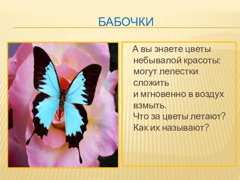 бабочки  А вы знаете цветы небывалой красоты: могут лепестки сложить и мгновенно в воздух взмыть. Что