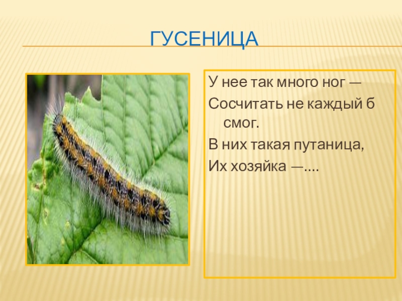 ГусеницаУ нее так много ног —Сосчитать не каждый б смог.В них такая путаница,Их хозяйка —….