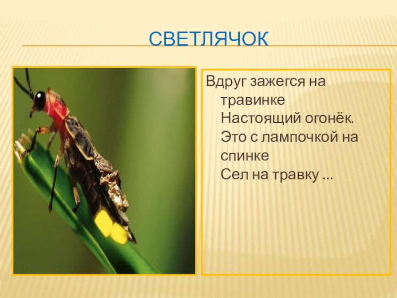 светлячокВдруг зажегся на травинке Настоящий огонёк. Это с лампочкой на спинке Сел на травку …