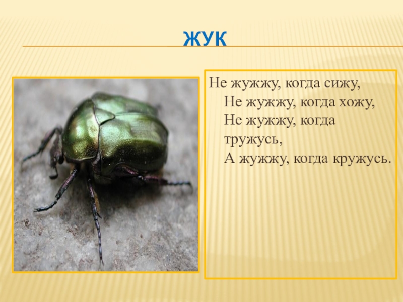 жукНе жужжу, когда сижу, Не жужжу, когда хожу, Не жужжу, когда тружусь, А жужжу, когда кружусь.