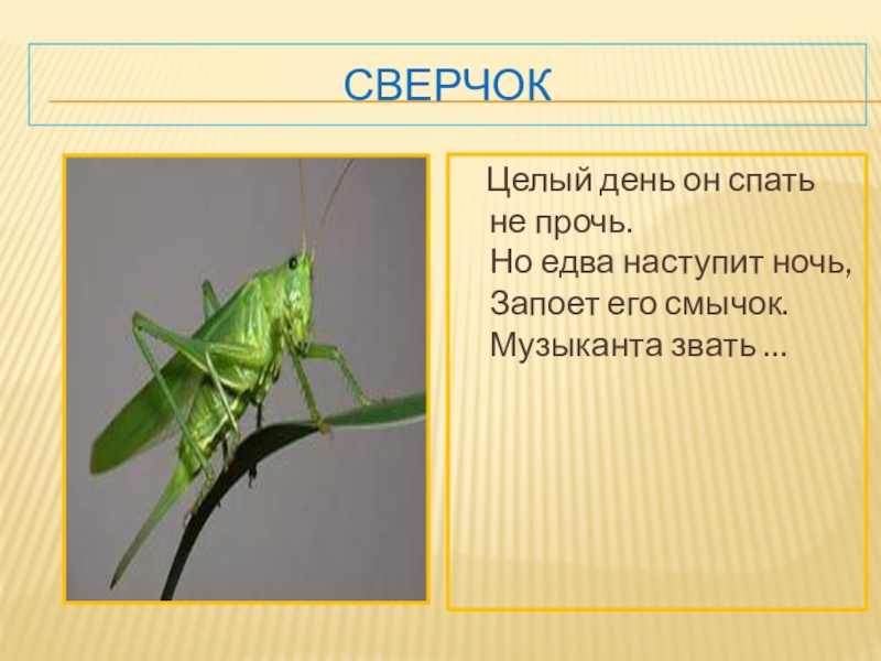 сверчок  Целый день он спать не прочь. Но едва наступит ночь, Запоет его смычок. Музыканта звать